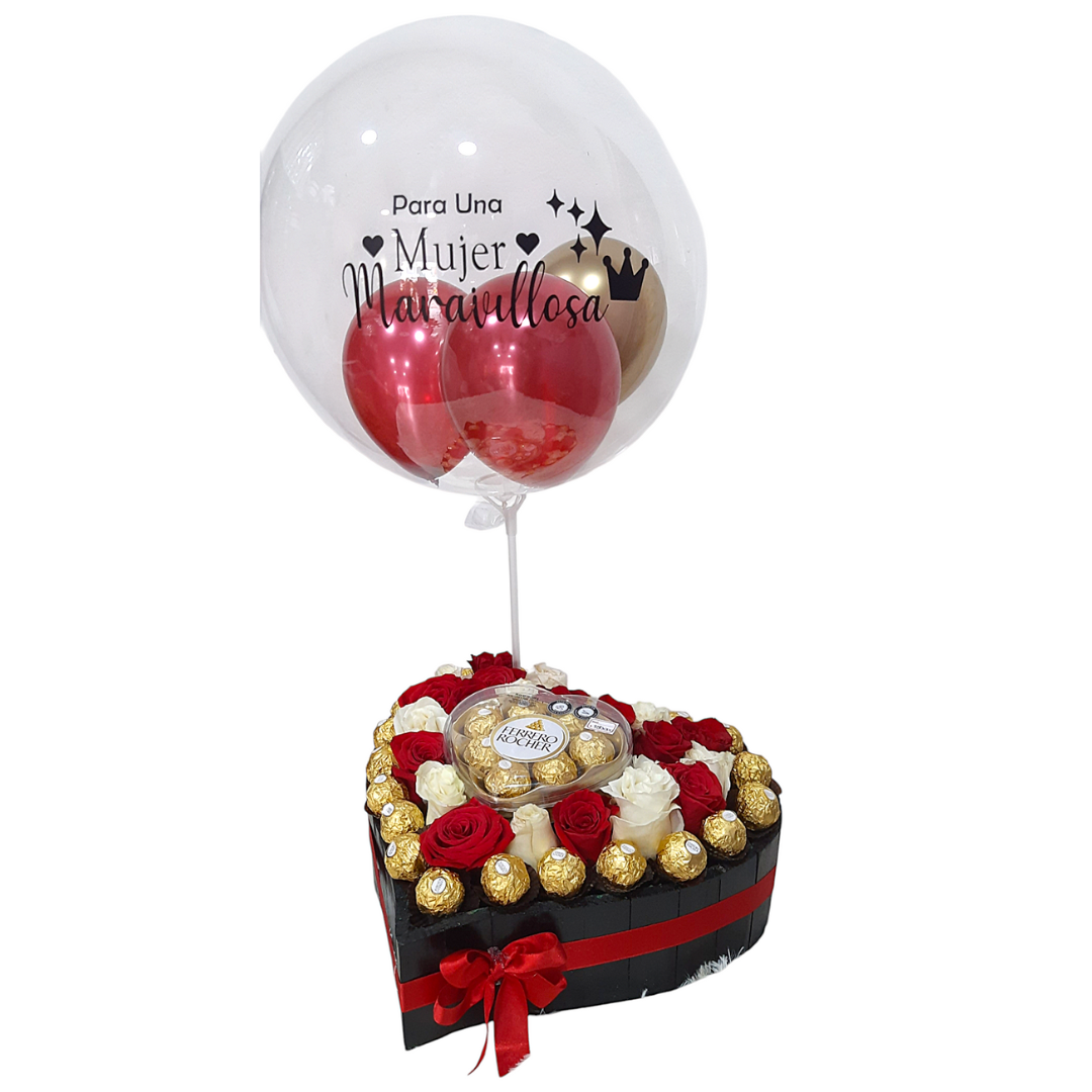 Caja en forma de corazón con rosas, chocolates Ferrero Rocher y un globo con mensaje "Para una mujer maravillosa.