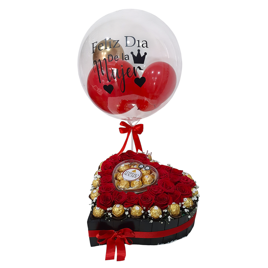 Caja en forma de corazón con rosas rojas y chocolates Ferrero Rocher, decorada con globo de "Feliz Día de la Mujer.