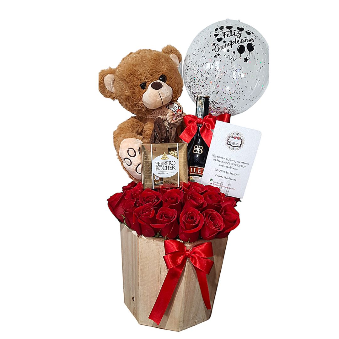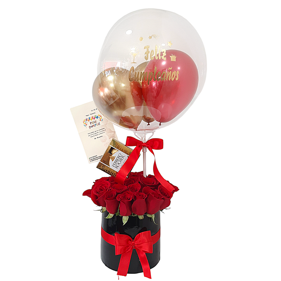 Arreglo floral con rosas rojas, globo de cumpleaños y chocolates Ferrero Rocher.