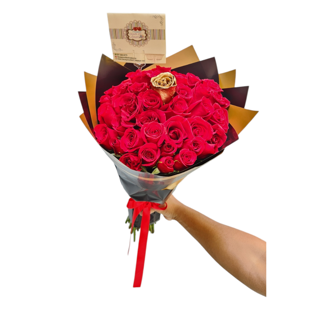 Buchón de rosas rojas con una rosa dorada, papel coreano y cinta roja, ideal para detalles elegantes.