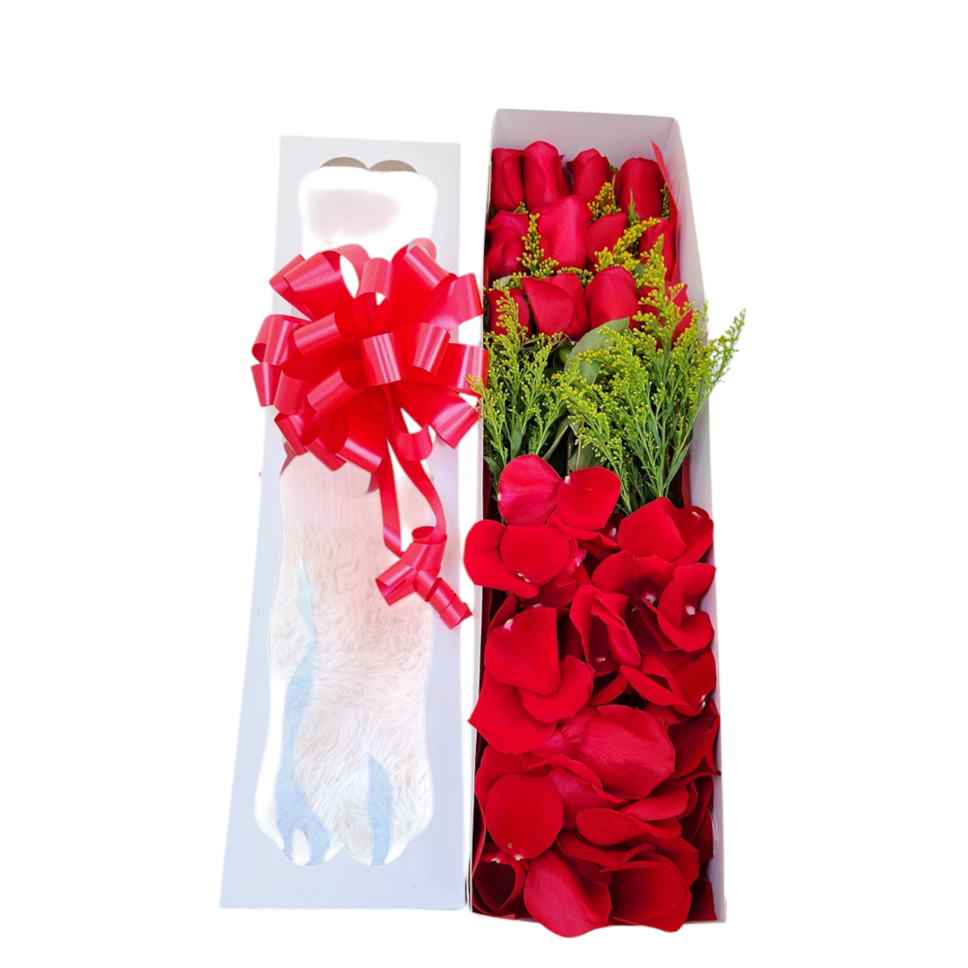 Caja blanca con 12 rosas rojas, pétalos, follaje, moño y tarjeta, un detalle romántico y elegante.