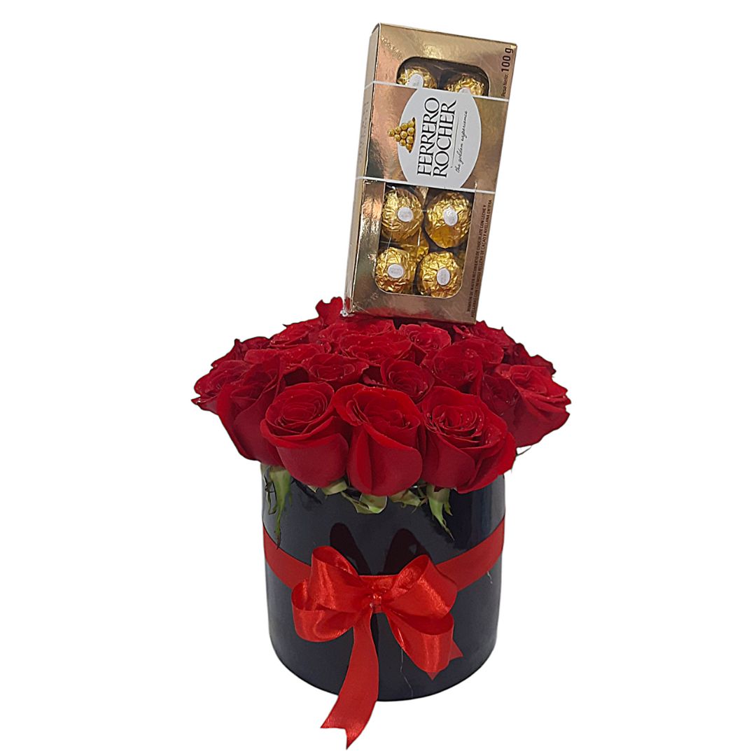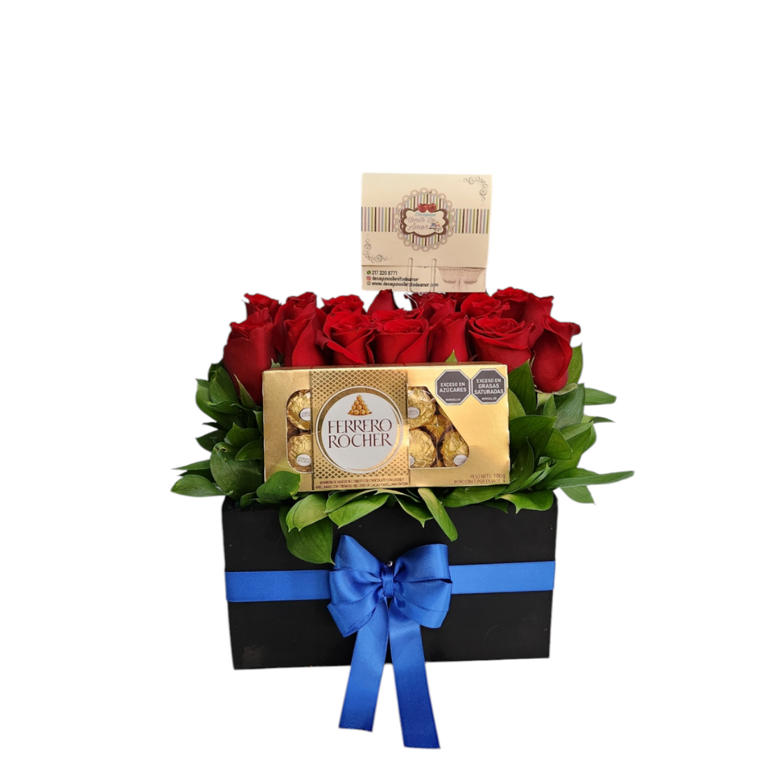 Caja negra con rosas rojas frescas y chocolates Ferrero Rocher, decorada con lazo rojo.