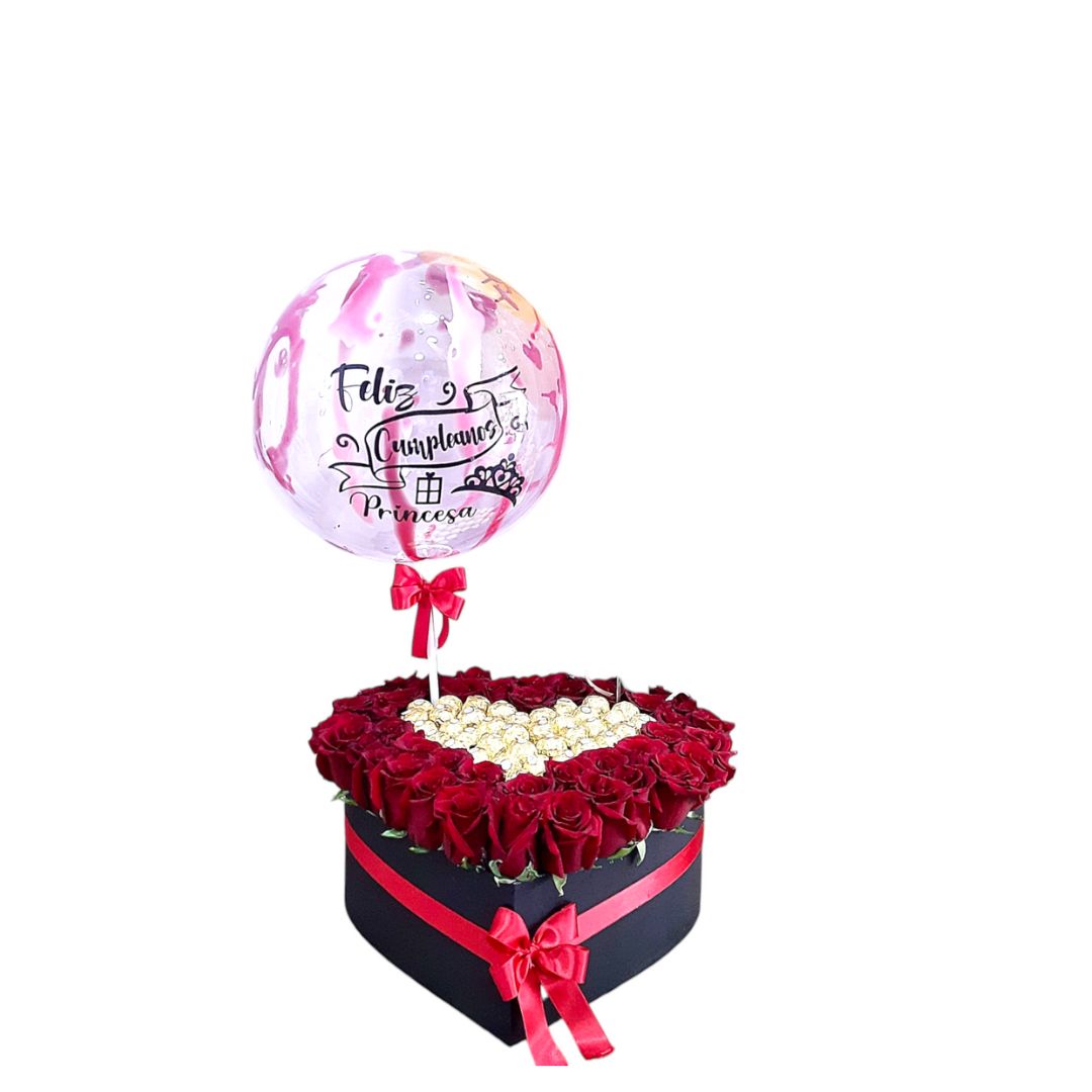 Caja de regalo en forma de corazón con rosas rojas, chocolates y globo con mensaje "Feliz Cumpleaños Princesa".