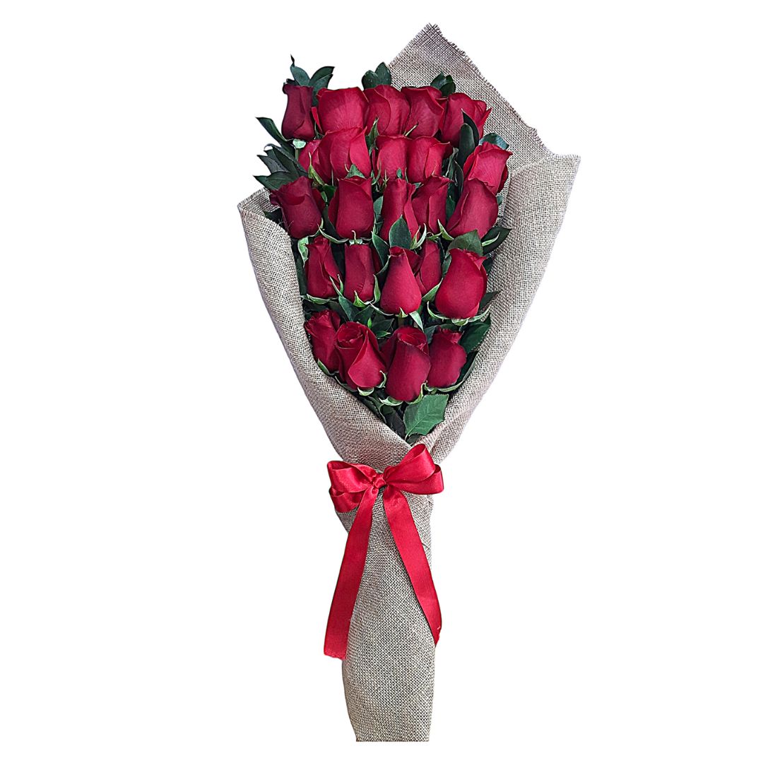 Ramo elegante de rosas rojas frescas envuelto en tela rústica con lazo rojo.