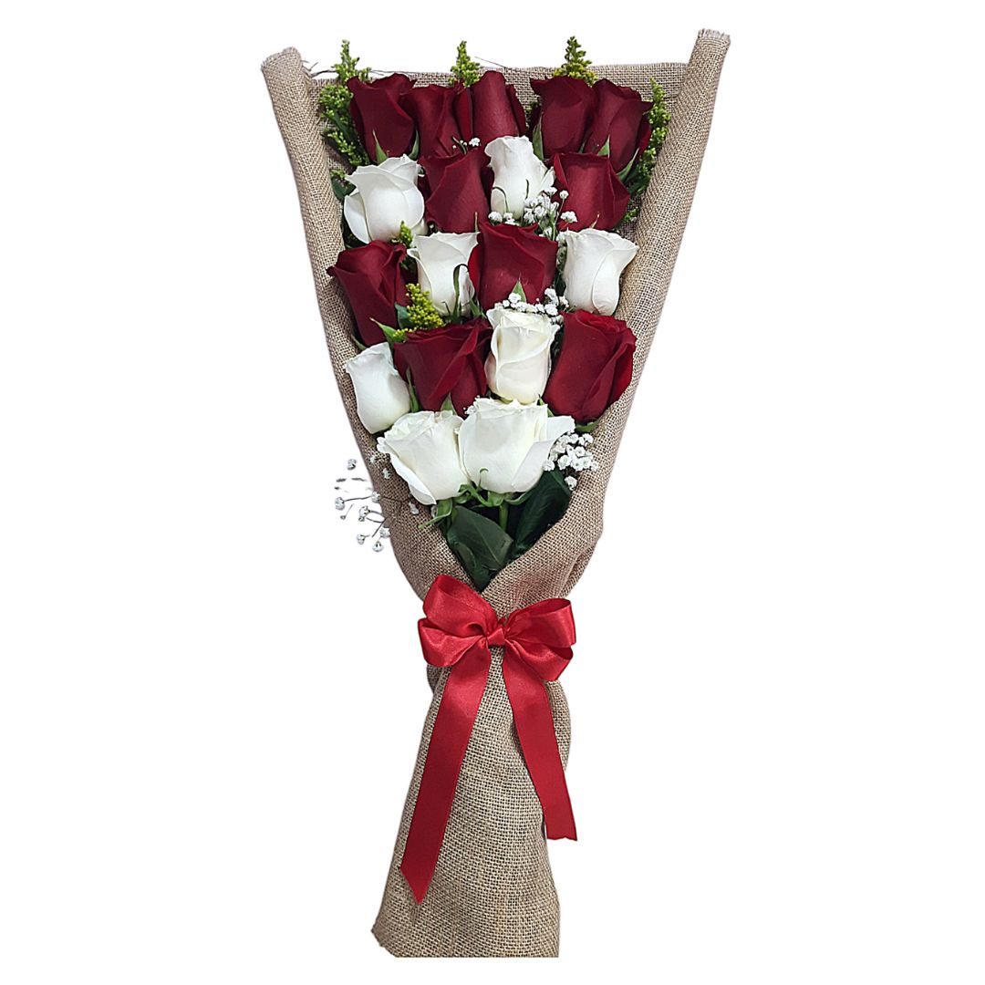 Ramo de rosas rojas y blancas frescas, envuelto en tela rústica con lazo rojo.