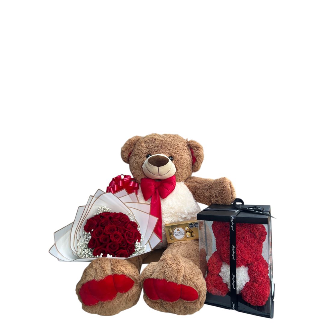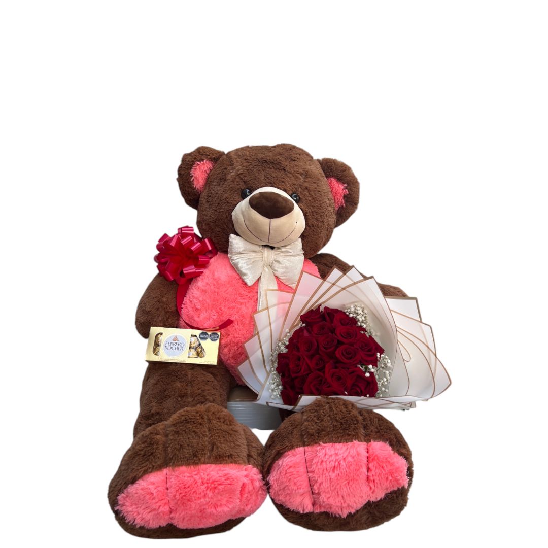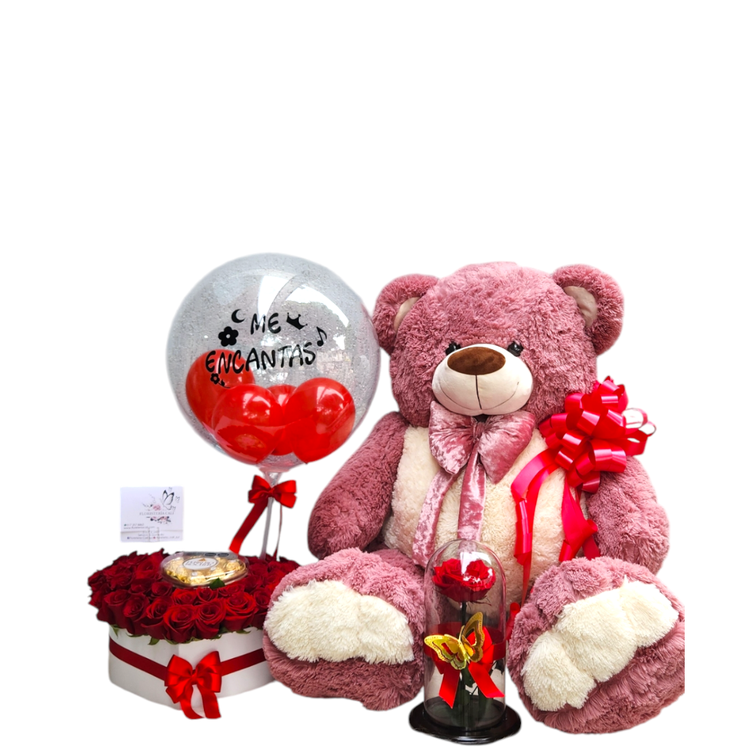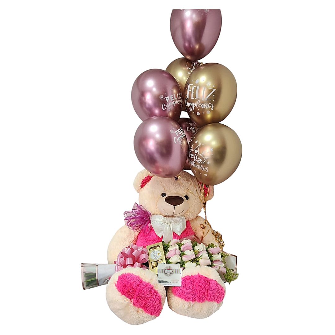 Oso d epeluche con boquet de rosas, chocolate y globo