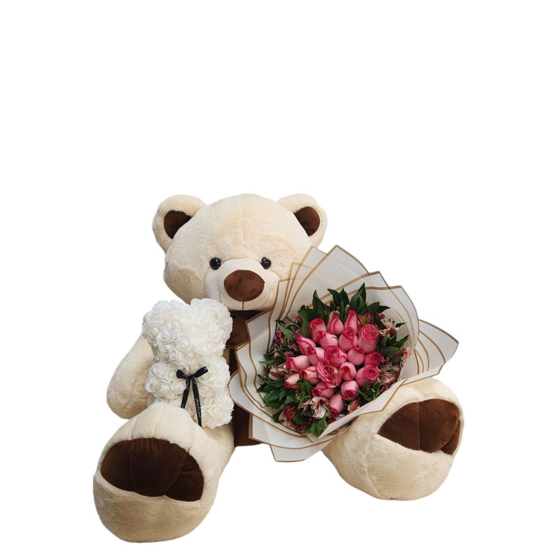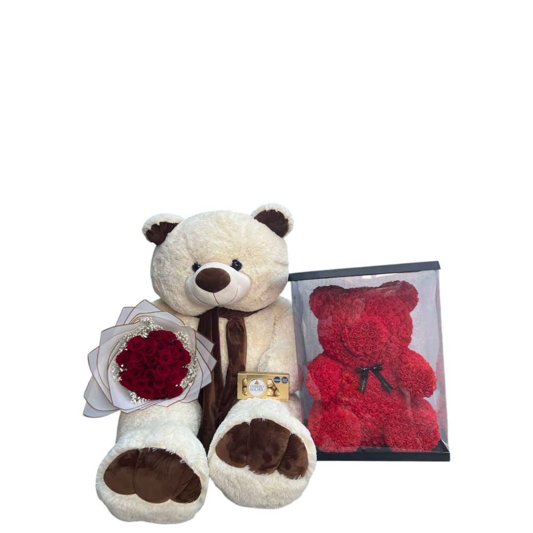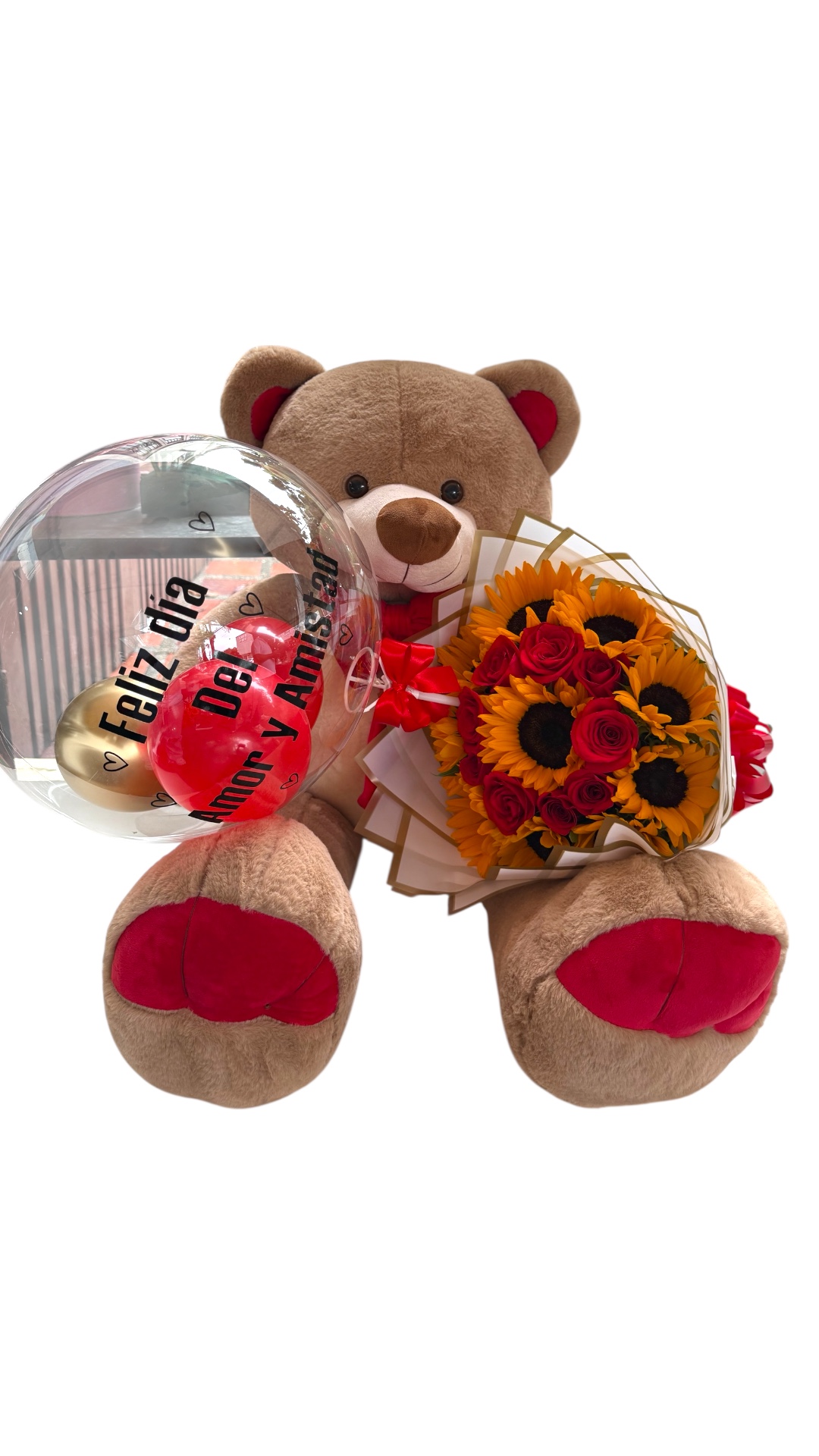 Oso d epeluche con boquet de rosas, chocolate y globo