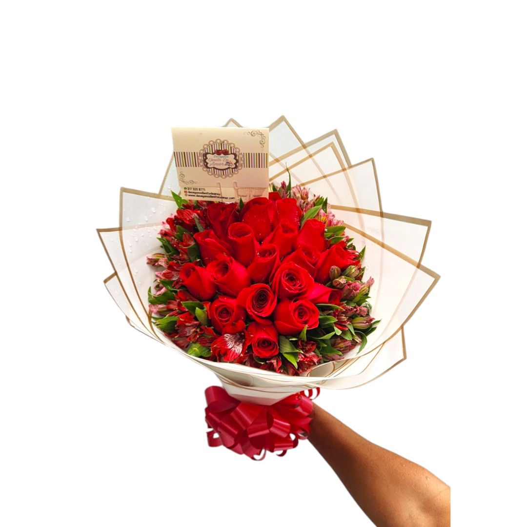Ramo de rosas rojas con tarjeta.