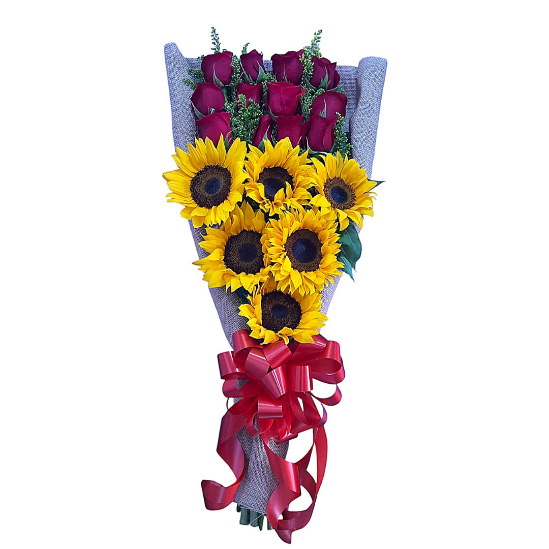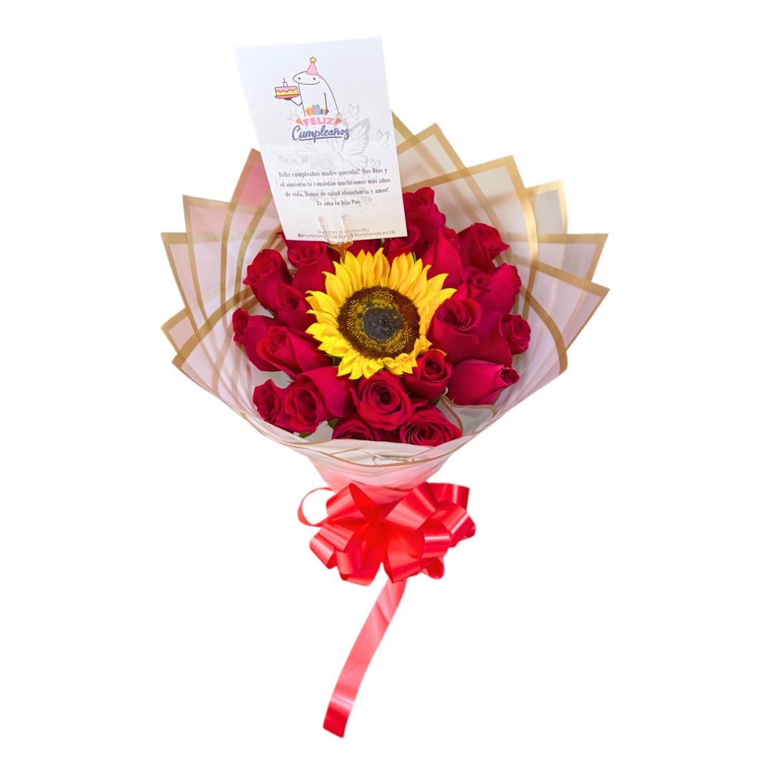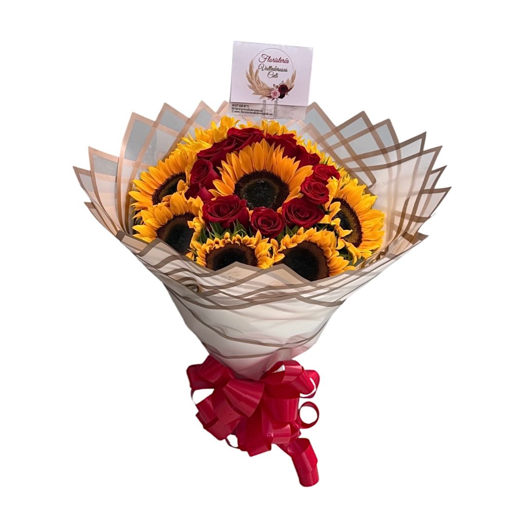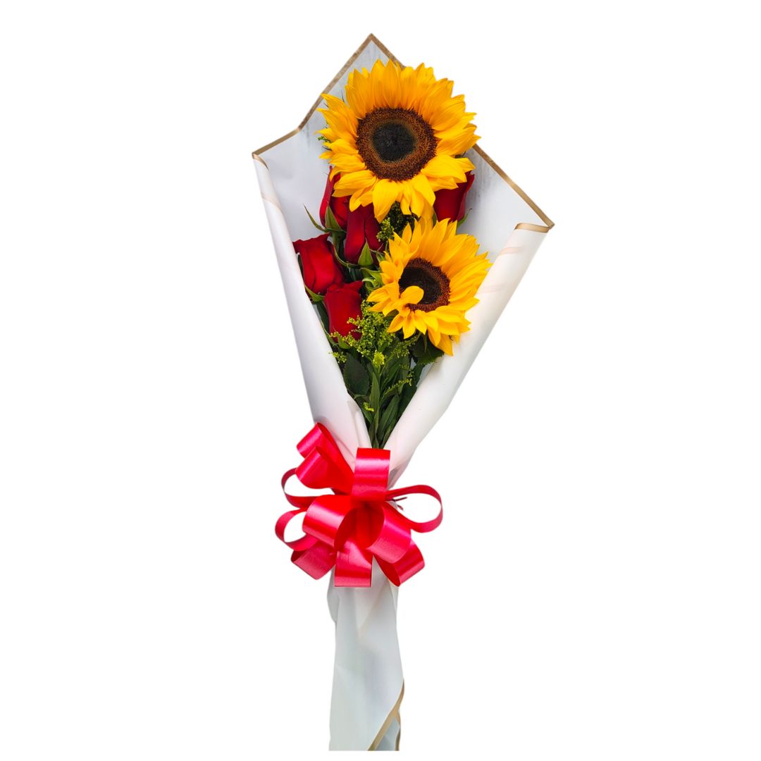 Ramo de girasoles y rosas rojas.