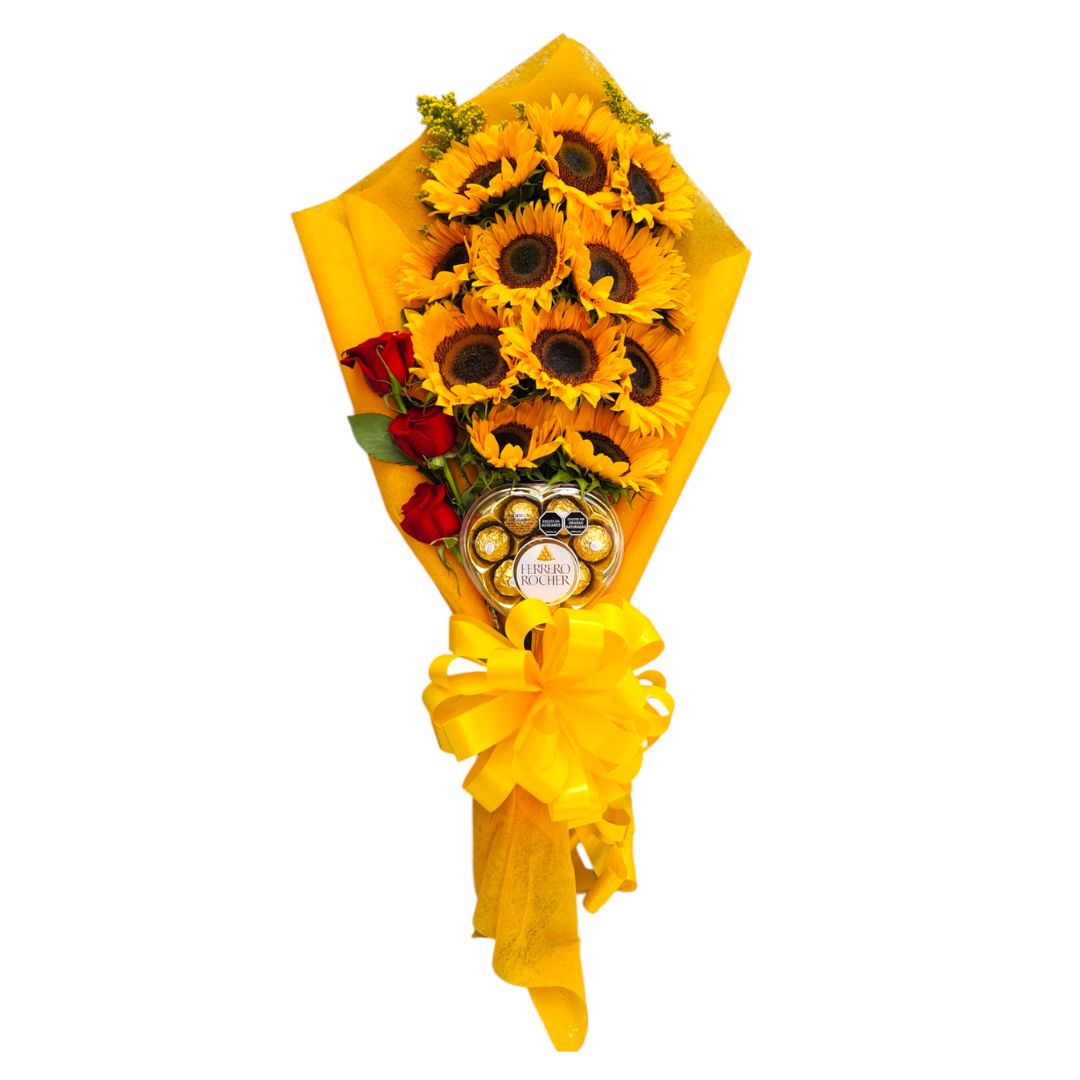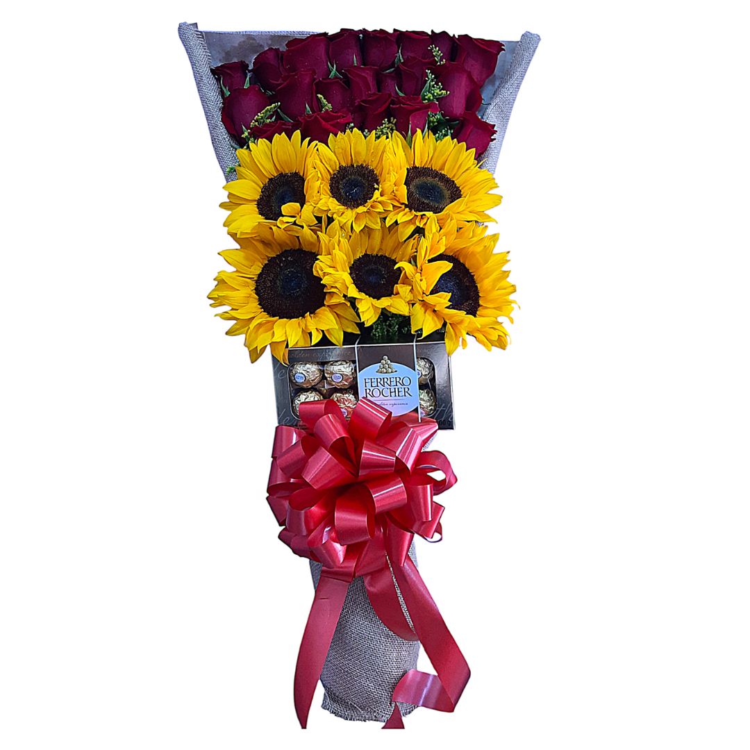 Rosas rojas, girasoles y Ferrero Rocher