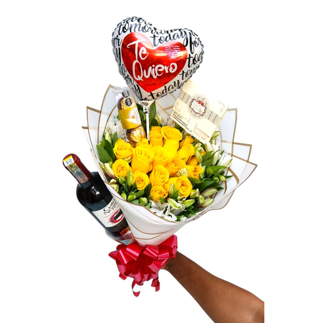 Ramo de rosas amarillas con globo y vino.