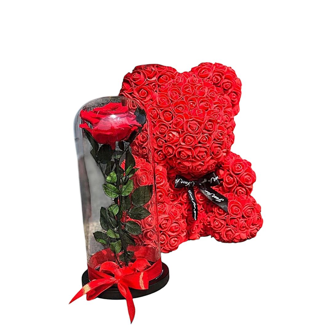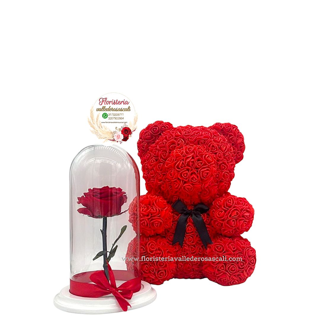 Rosa roja y osito de flores con campana de vidrio.