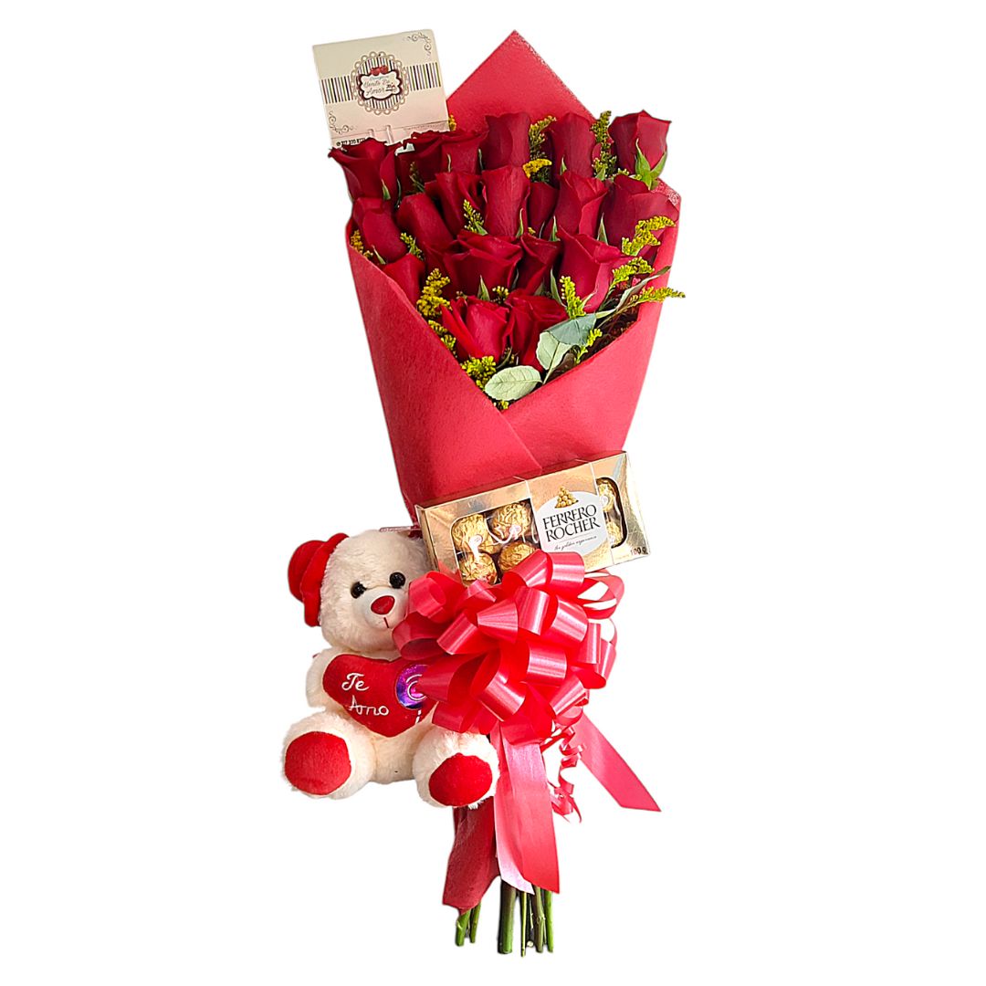 Rosas rojas y peluche con chocolates Ferrero Rocher