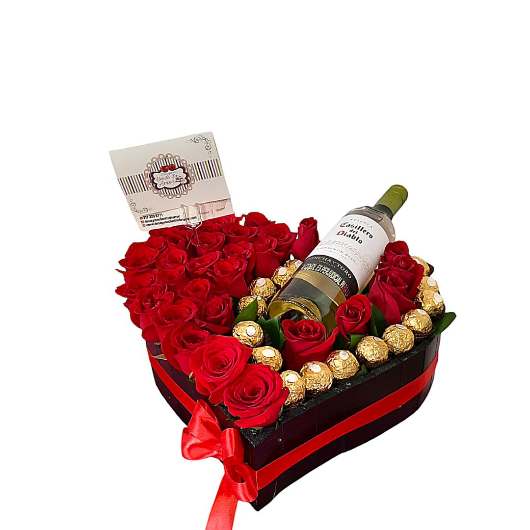 Corazón de rosas rojas con vino y Ferrero Rocher
