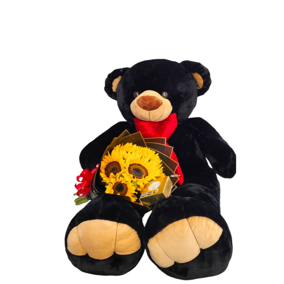 Oso de peluche negro con girasoles y chocolates.