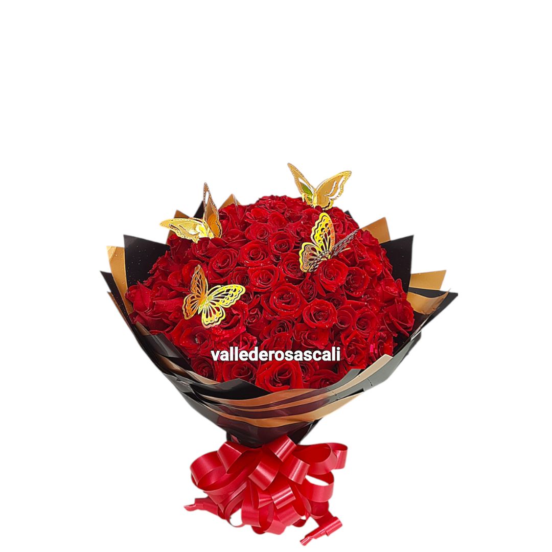 Ramo de rosas rojas con mariposas doradas.