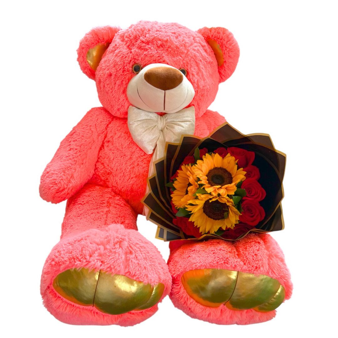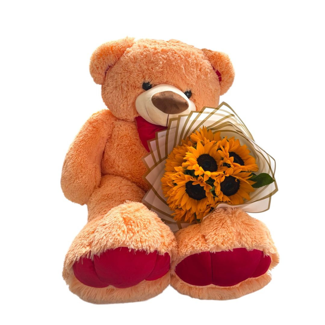 Oso de peluche con flores de girasol y chocolates.