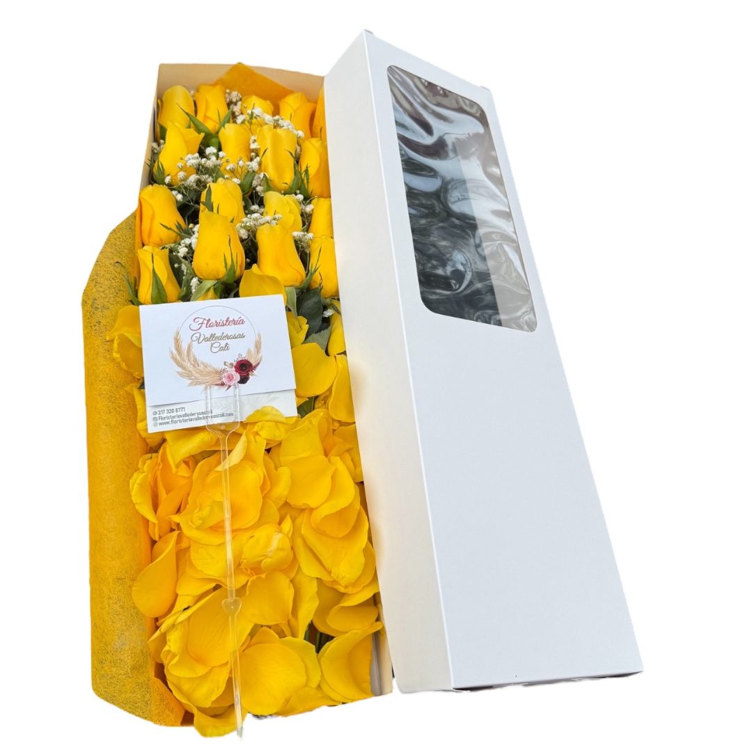 Caja elegante con rosas amarillas y pétalos – Floristería en Cali