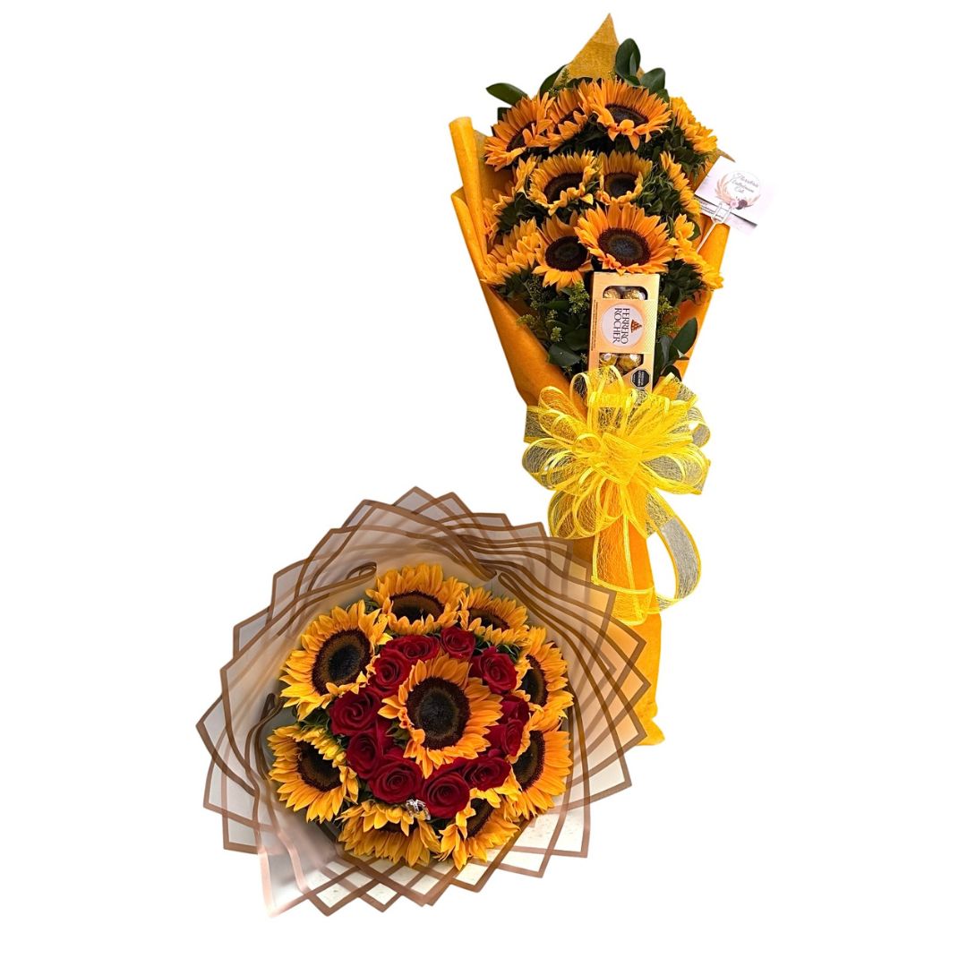 Ramo y bouquet de girasoles con rosas rojas