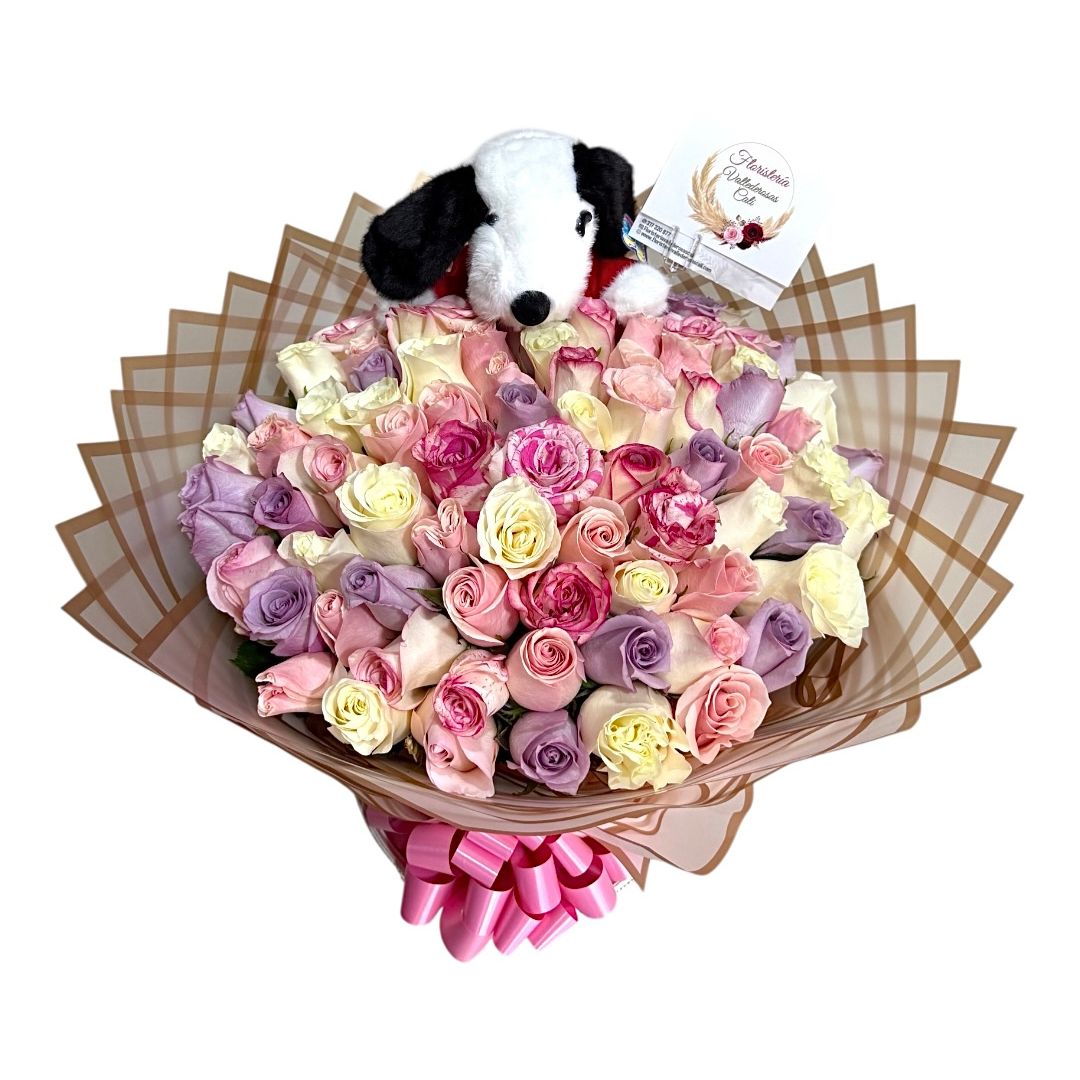Bouquet de rosas en tonos pastel con peluche Snoopy