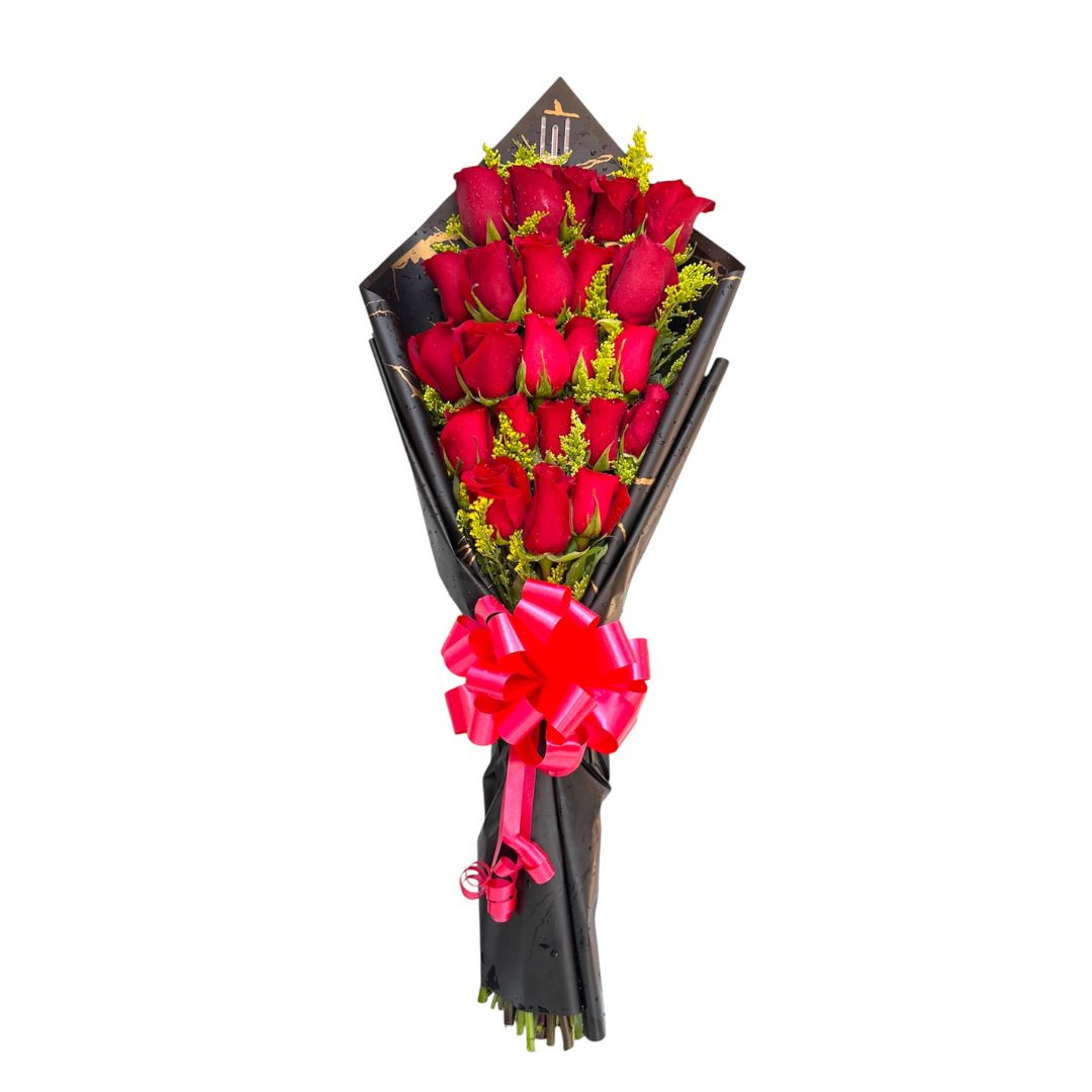 Bouquet de rosas rojas con empaque negro y lazo rojo