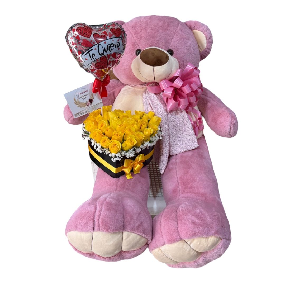 Oso de peluche gigante rosa con rosas amarillas y globo Te Quiero