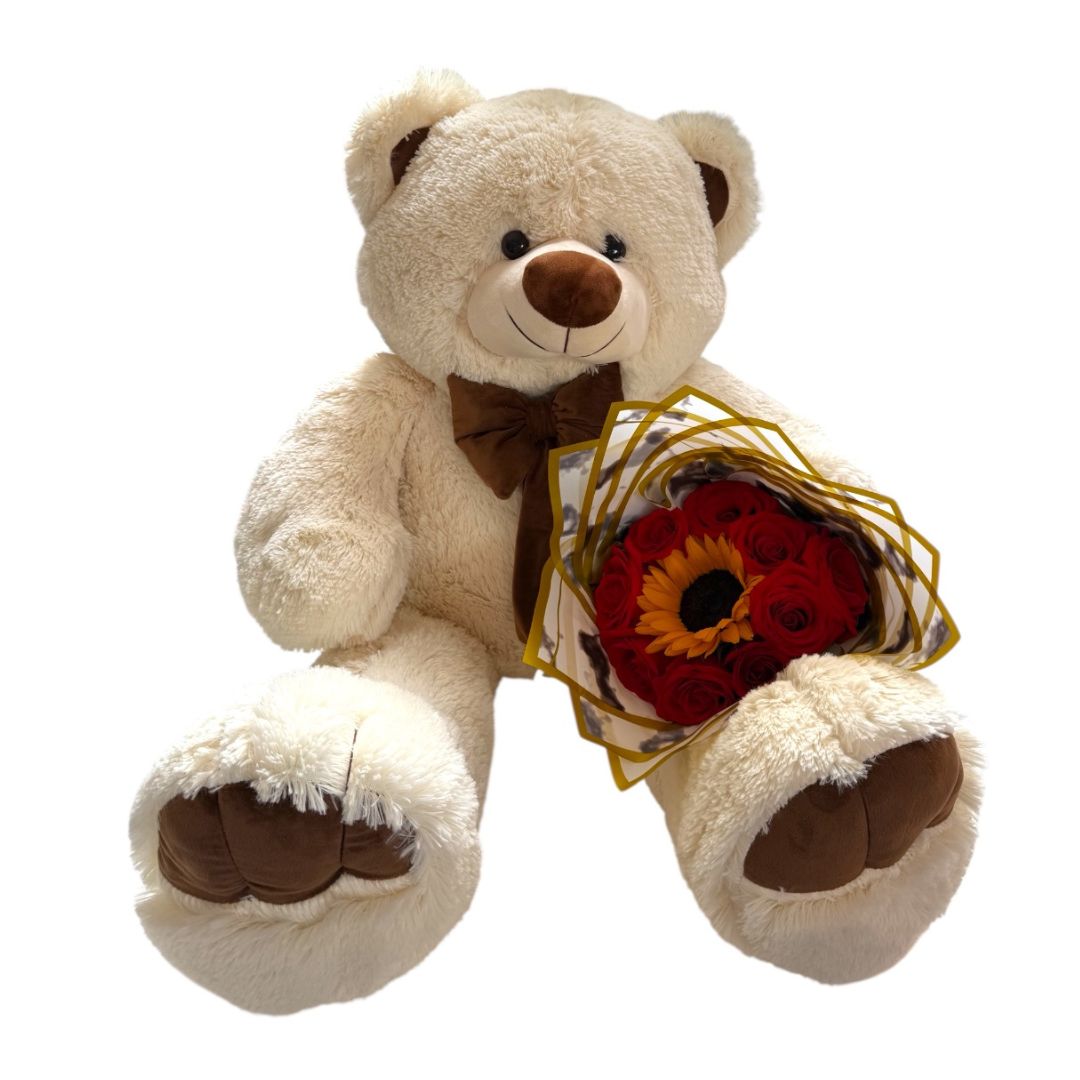 Oso de peluche con flores rojas y girasoles.