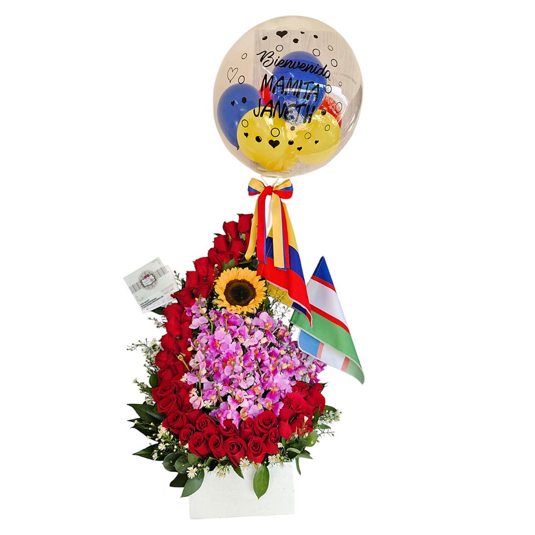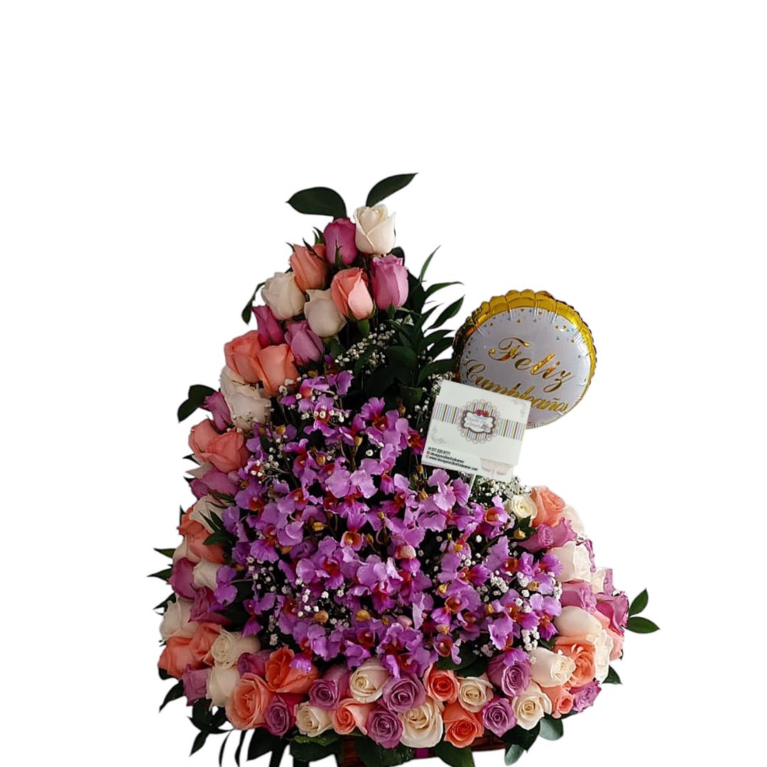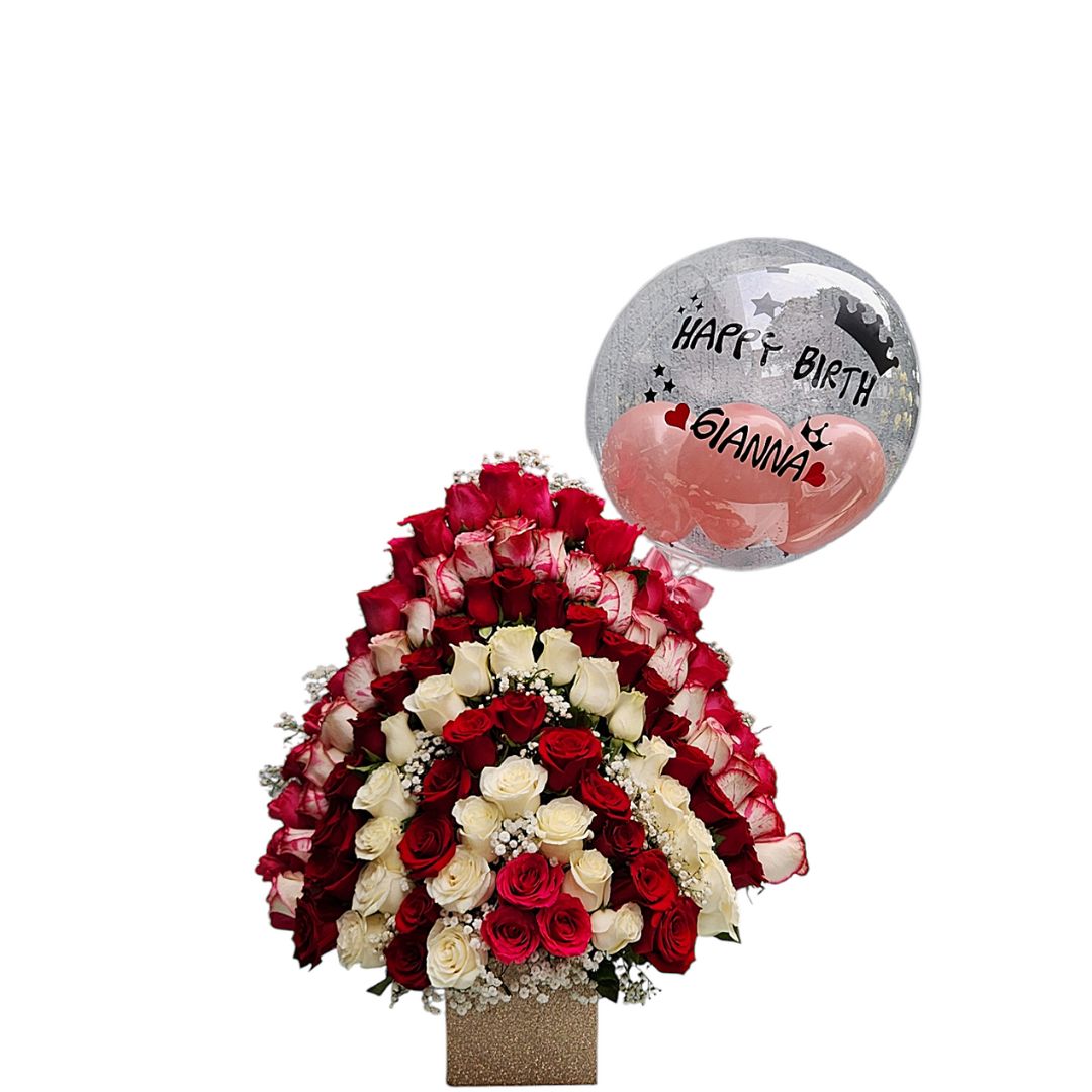 Arregllo media luna con rosas orquideas y un girasol y glboo personalizado
