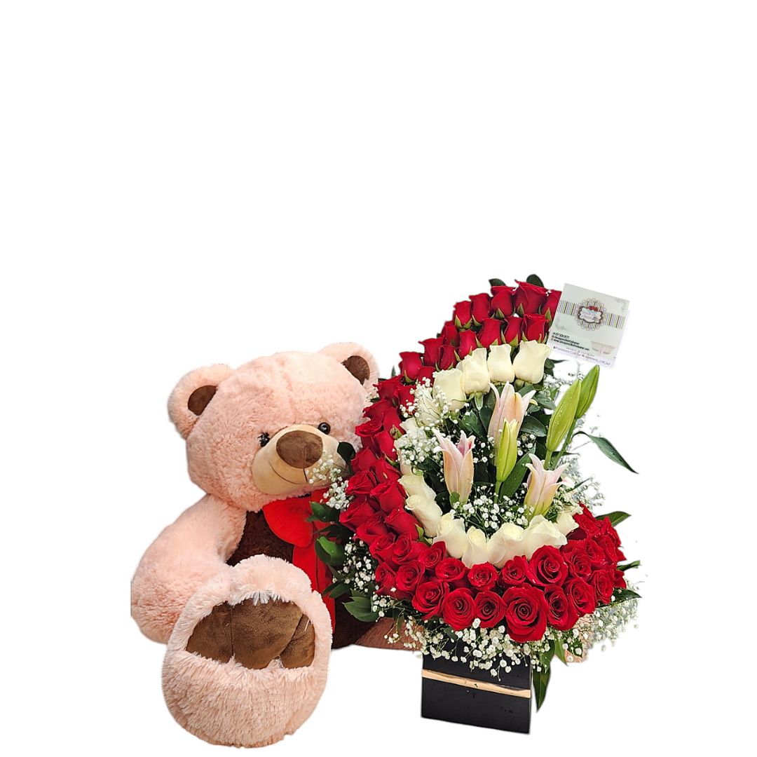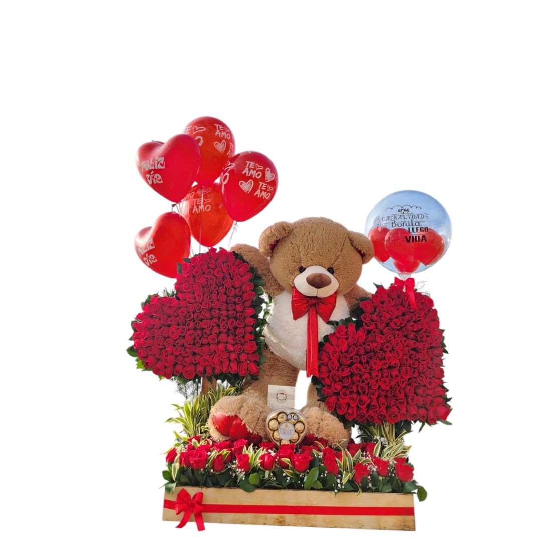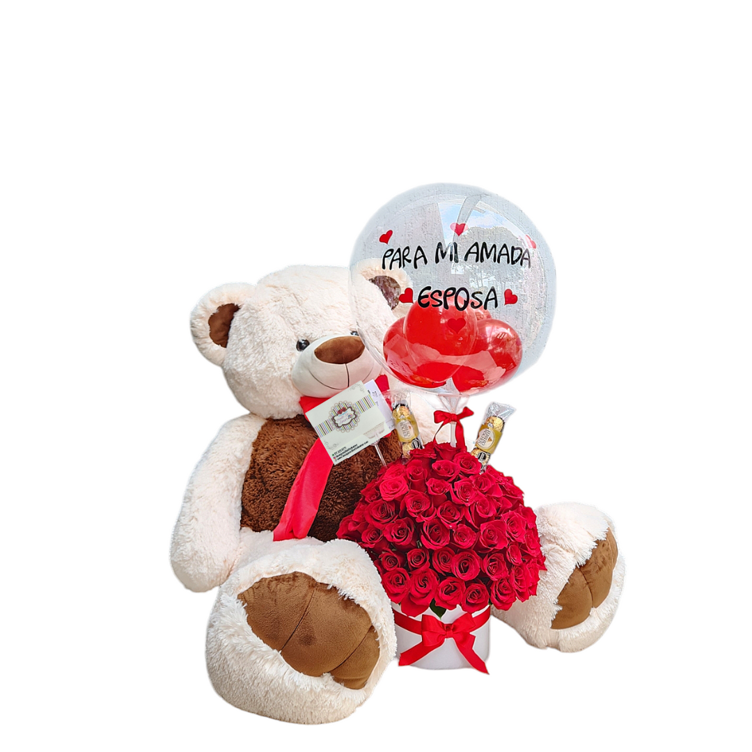 Oso d epeluche con boquet de rosas, chocolate y globo
