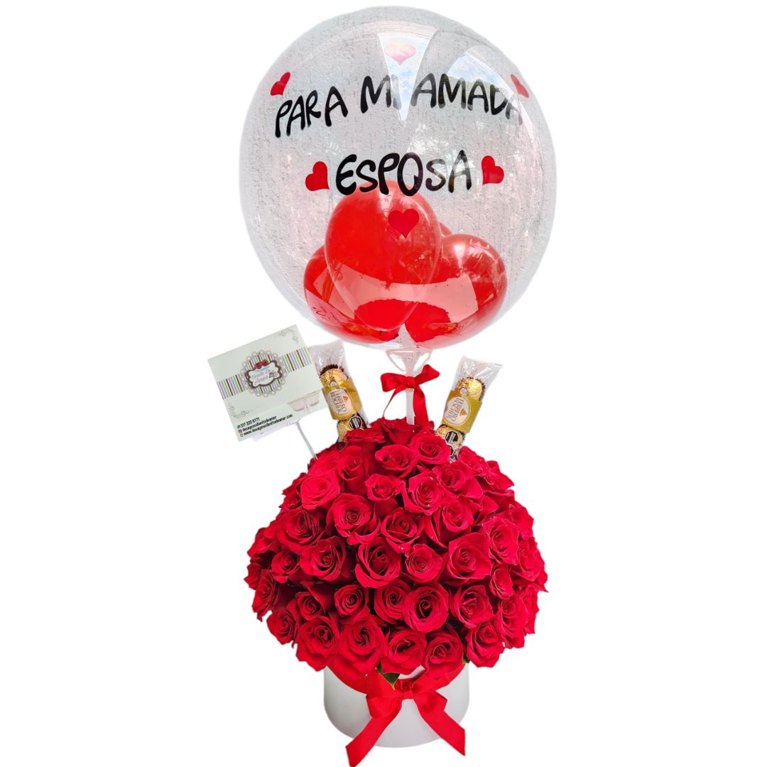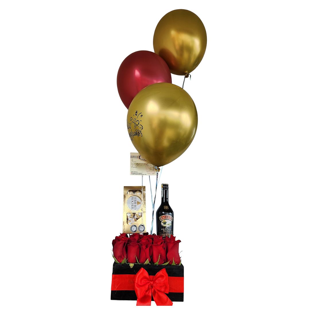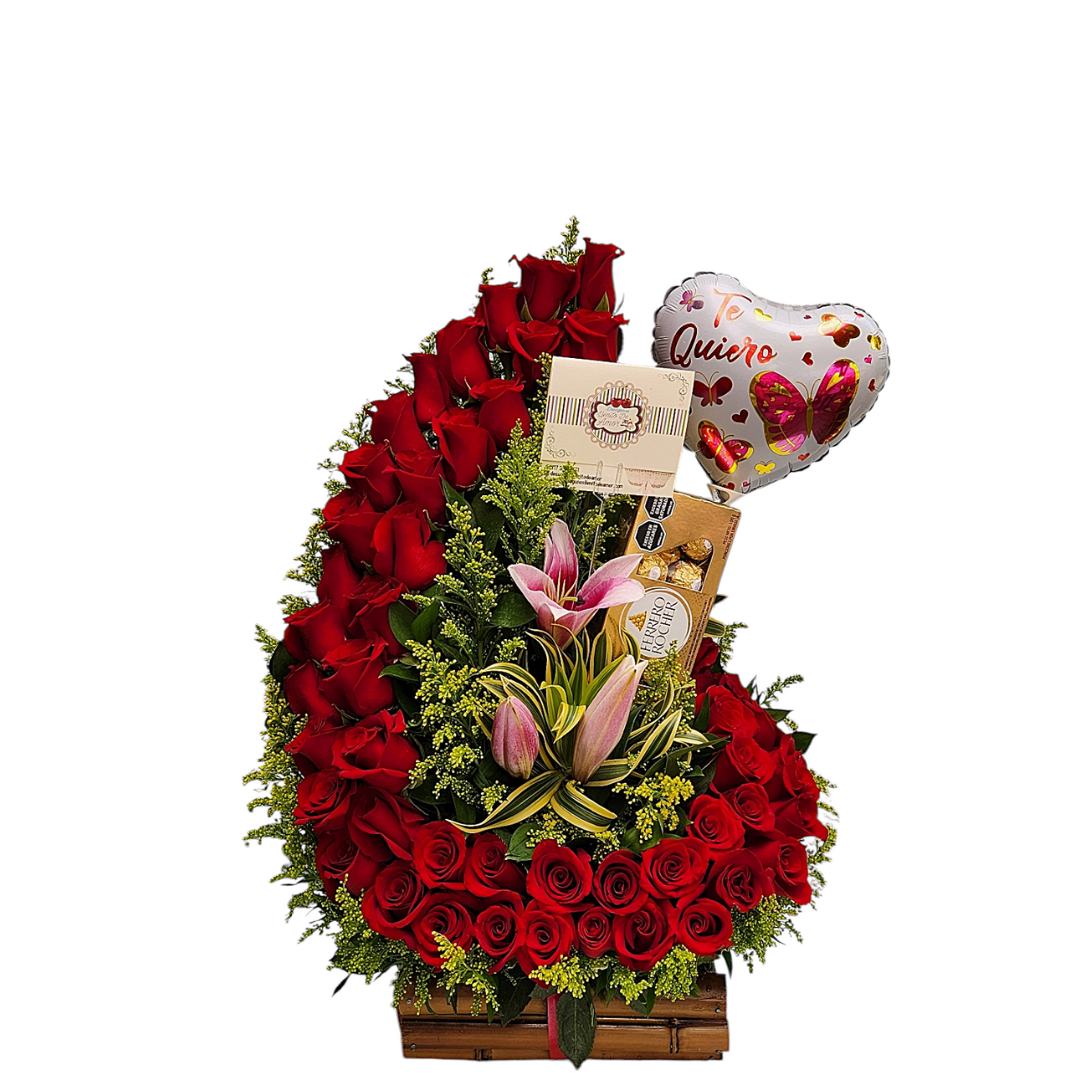 Arreglo floral con rosas rojas, lirios, chocolates y un globo, perfecto para celebrar ocasiones especiales.
