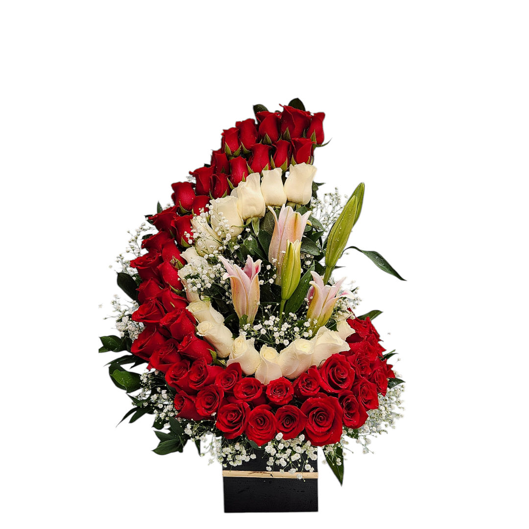 Arreglo floral en media luna con rosas rojas y blancas, lirios y follaje perla, ideal para ocasiones románticas o elegantes.