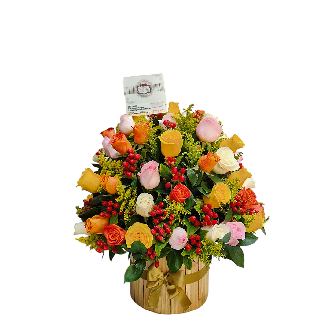 Arreglo floral redondo con una variedad de rosas surtidas en colores vibrantes, perfecto para cualquier ocasión