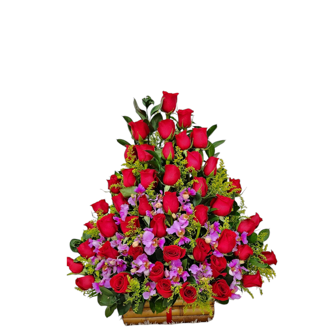 Arreglo floral en forma de triángulo con rosas rojas y orquídea hawaiana, ideal para regalar en ocasiones especiales.