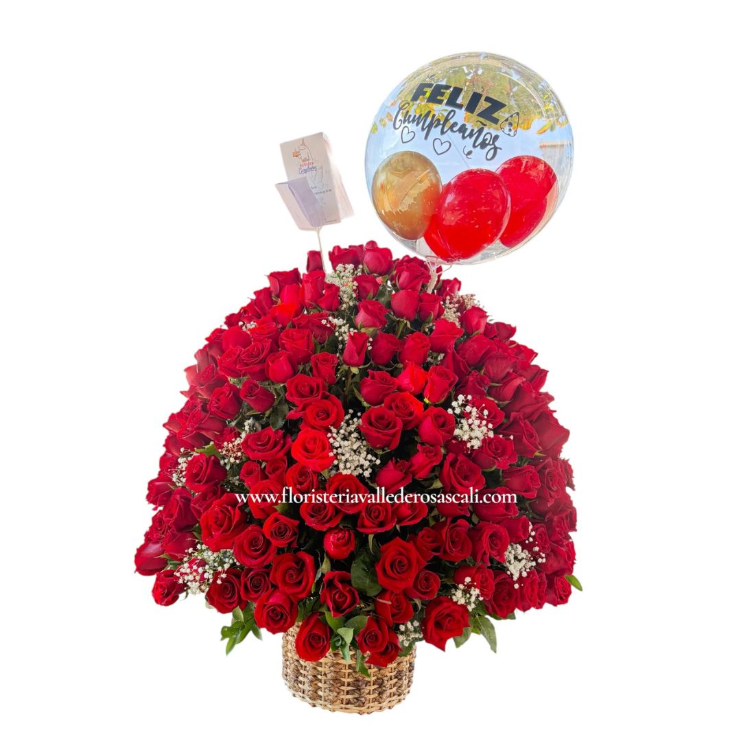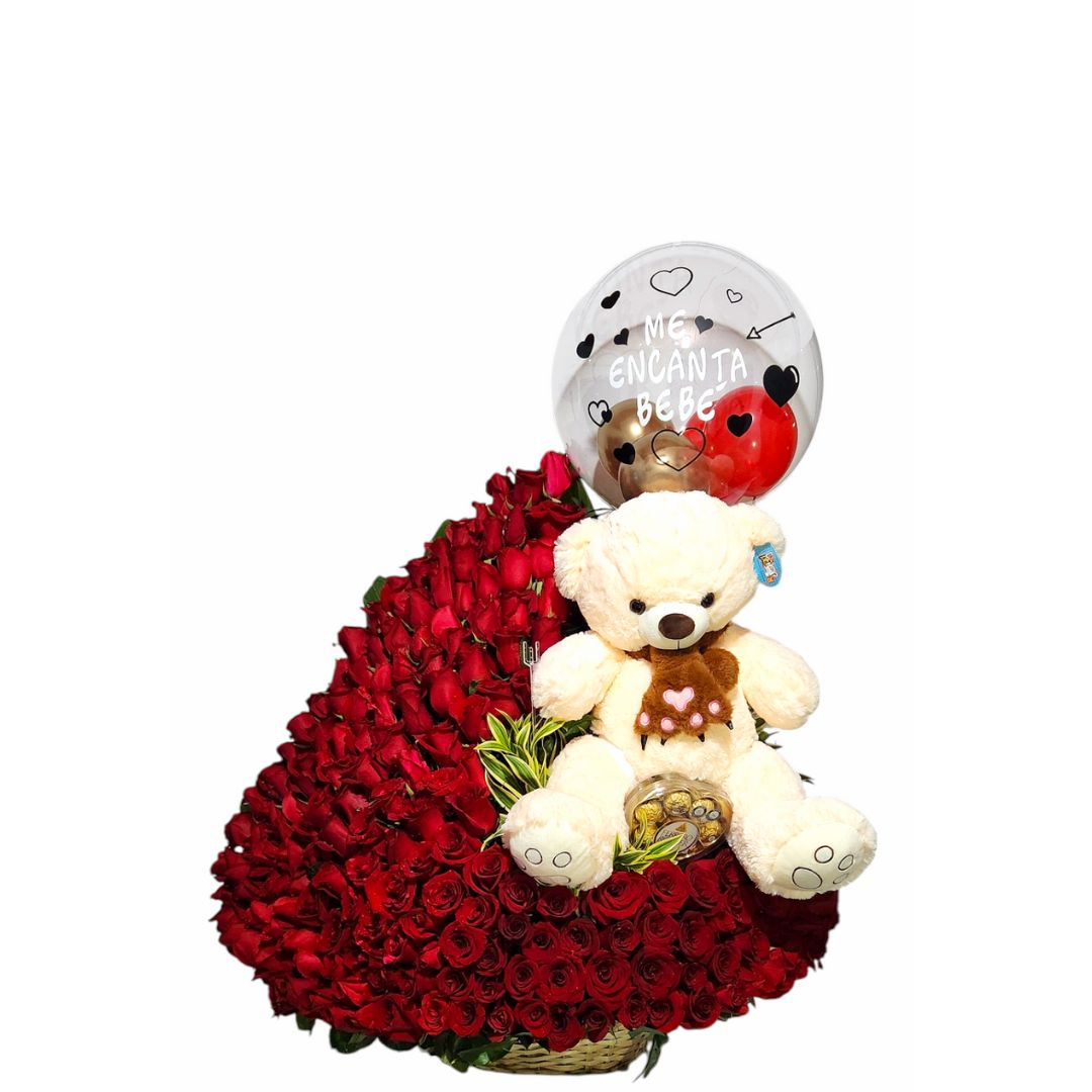 Canasta con rosas, peluche, chocolates y globo personalizado