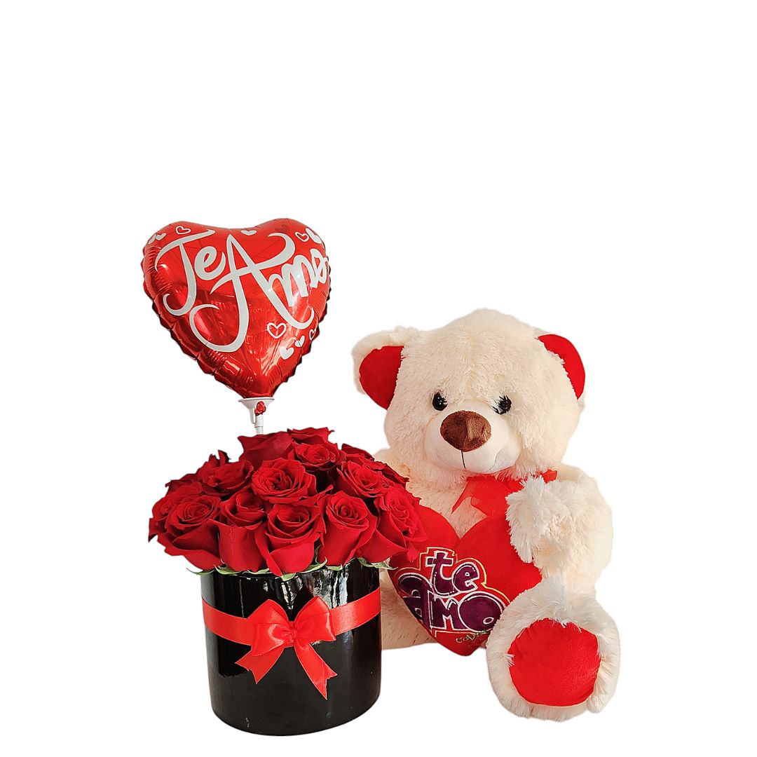 Cilindro con rosas rojas, peluche, chocolates y globo personalizado, ideal para detalles románticos o celebraciones especiales.