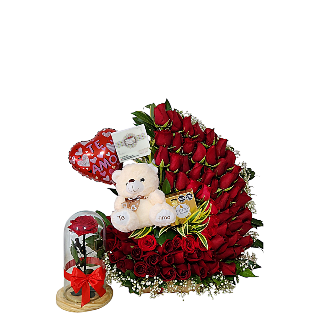 Arreglo en forma de media luna con rosas rojas, peluche, chocolates, una rosa inmortalizada y globo metalizado, ideal para momentos únicos.