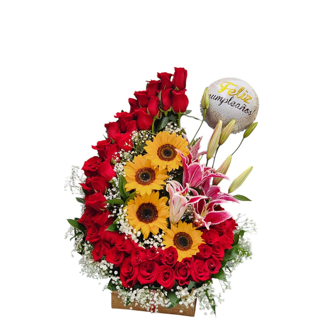 Arreglo en forma de corazón con rosas, girasoles, follaje y un globo metalizado, ideal para sorprender a alguien especial