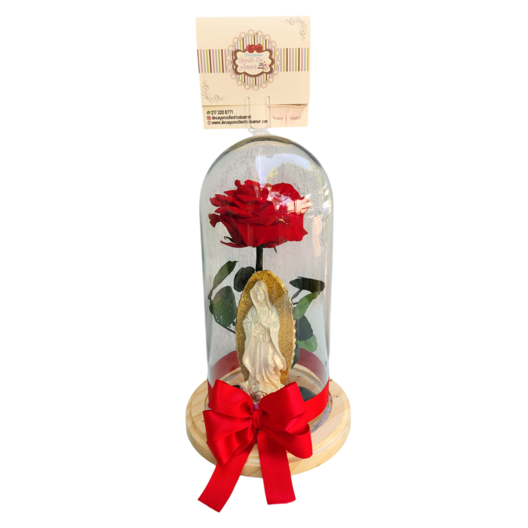 Rosa inmortalizada acompañada de una imagen de la Virgen, un detalle único y simbólico.