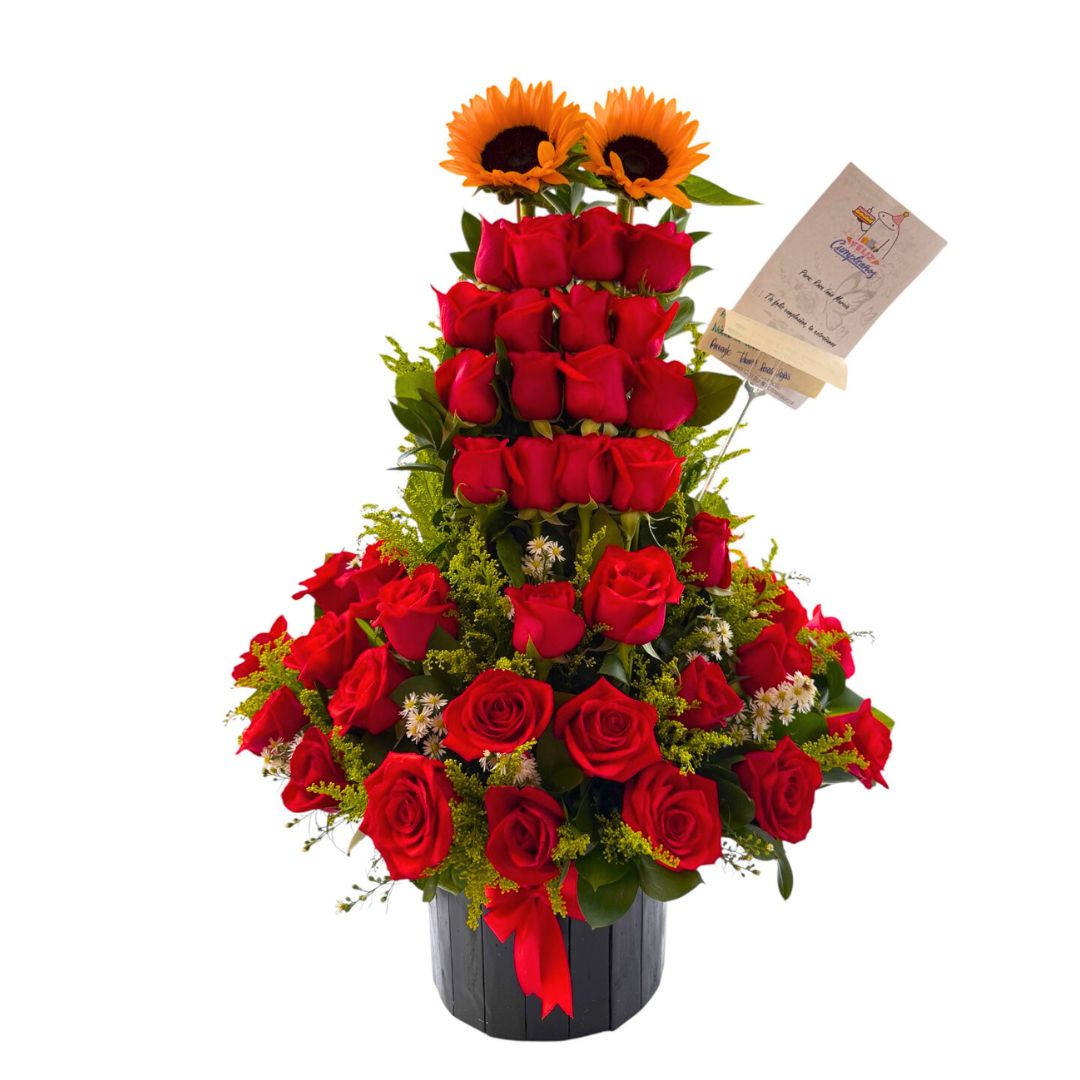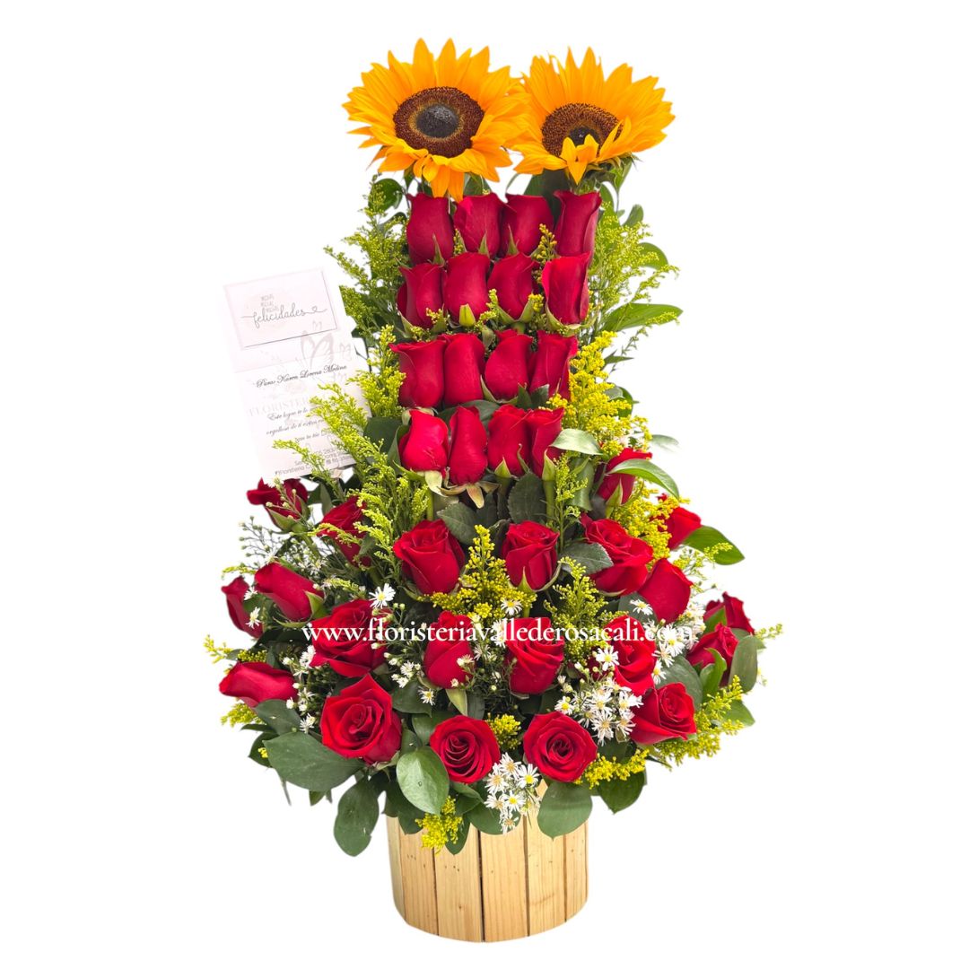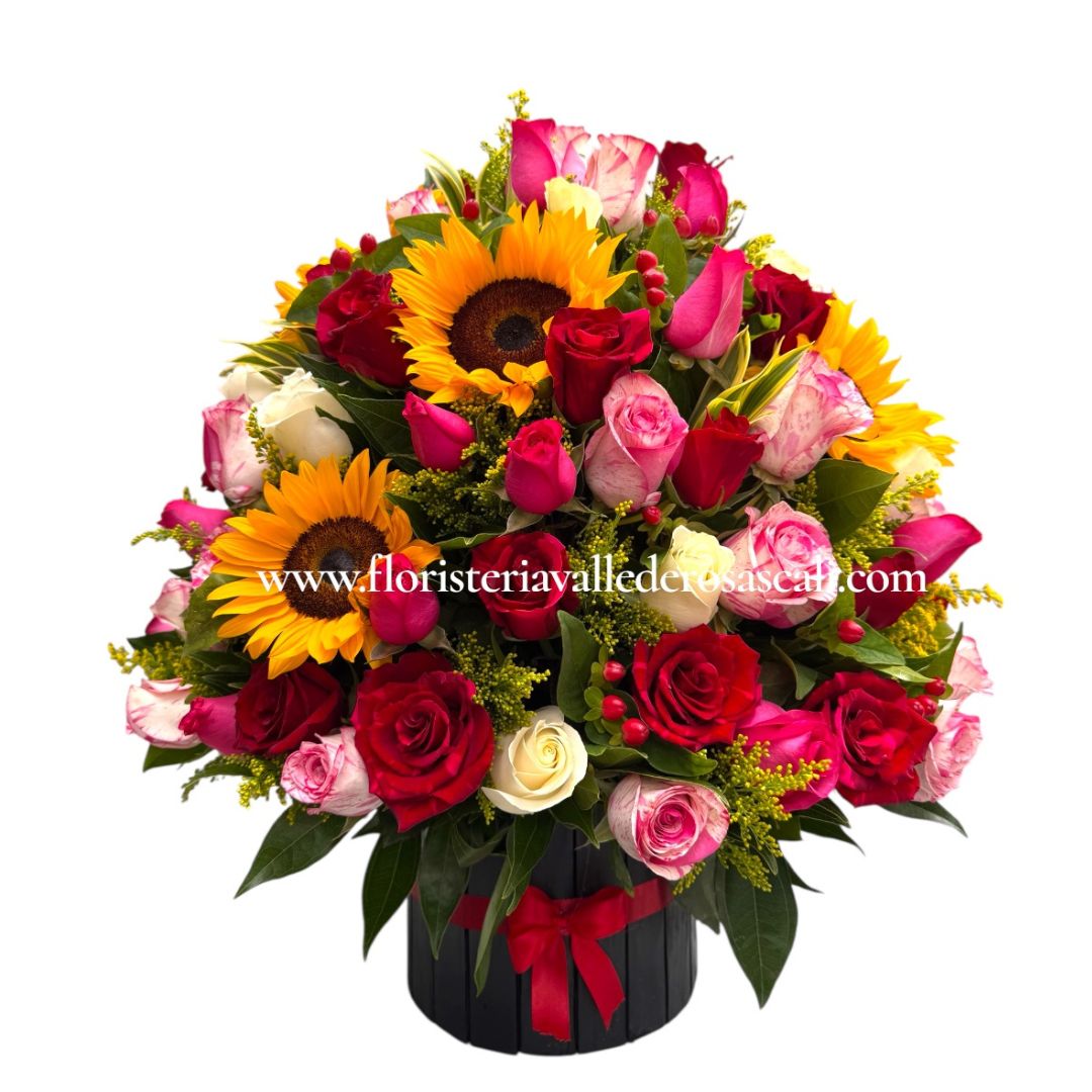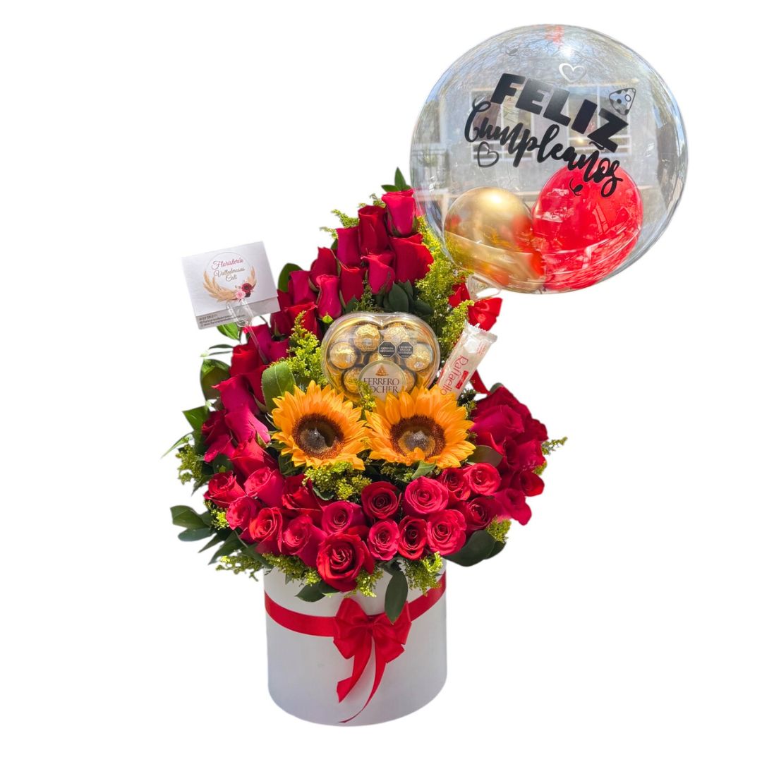 Arreglo floral con rosas rojas, girasoles y chocolates Ferrero